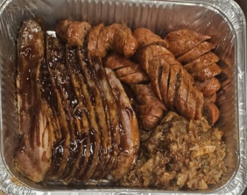 1 lb each of our House Smoked Meats. Sliced Beef Brisket, Hot Italian Sausage and Pulled Pork. Includes 24 oz. of Cole Slaw, 24 oz of Baked Beans, Pickles, BBQ Sauce and 12 Liscio's Slider Rolls. Feeds 6.